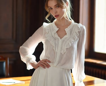 This style seamlessly blends vintage romanticism with modern executive polish, creating a look that is both authoritative and ethereal. It pairs the structured, architectural lines of a pleated high-neck bodice with the soft, airy textures of a ruffled Victorian-inspired blouse. The high-waisted tailoring and cinched gold-buckle belt provide a sharp, modern frame, while delicate gold drop earrings and flowing sheer fabrics introduce a touch of classical femininity. This ensemble is designed for the woman who commands a room with quiet confidence and impeccable, refined taste.