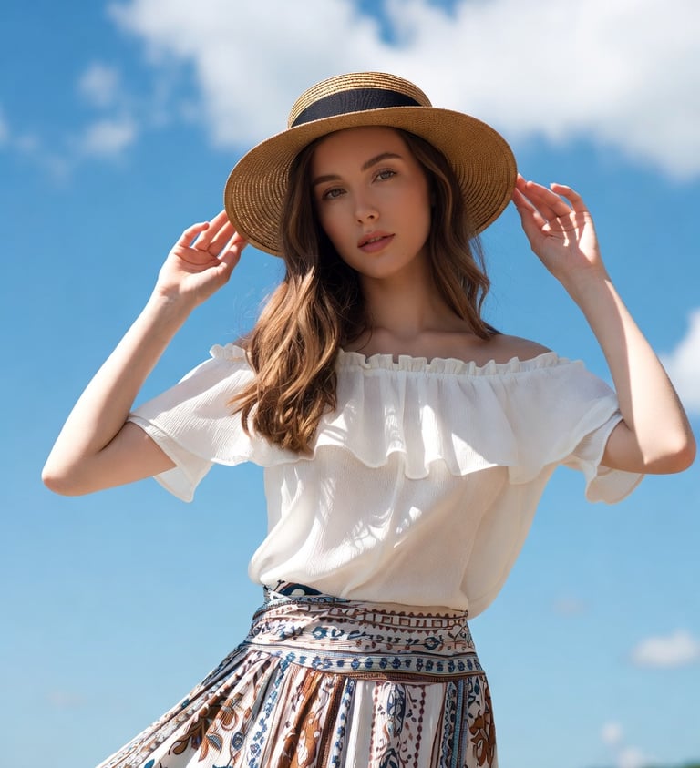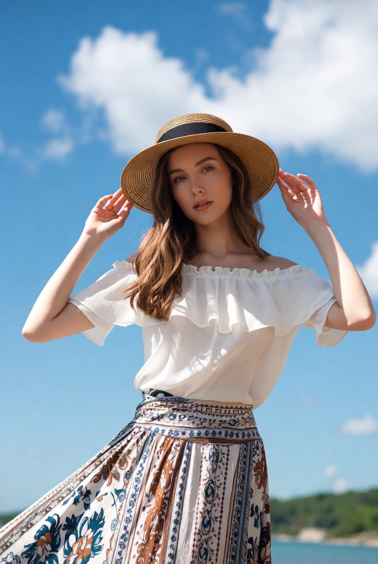 This style captures an essence of effortless summer escapism, blending breezy romanticism with a laid-back, artisanal spirit. It features a lightweight, off-the-shoulder white blouse with delicate ruffled trim that evokes a sense of airy freedom and femininity. The look is grounded by a high-waisted maxi skirt adorned with intricate, multi-tonal botanical and geometric prints, reminiscent of classic Mediterranean or coastal tiling. Completed with a wide-brimmed straw sunhat featuring a contrasting black ribbon, this ensemble is designed for sun-drenched days and scenic vistas, offering a perfect balance of rustic charm and polished elegance.