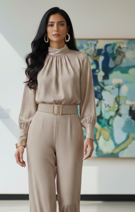 This Ethereal Gallery Monochromatic ensemble defines modern sophistication through a seamless blend of architectural structure and fluid grace. The look features a luxurious silk-satin mock-neck blouse with elegant pleated detailing and dramatic bishop sleeves, perfectly paired with high-waisted, wide-leg trousers that create a statuesque silhouette. A coordinated gold-buckled belt cinches the waist to add definition, while statement pearl hoop earrings and stacked gold bangles provide a refined metallic contrast against the soft champagne fabric, resulting in a polished, high-fashion aesthetic.