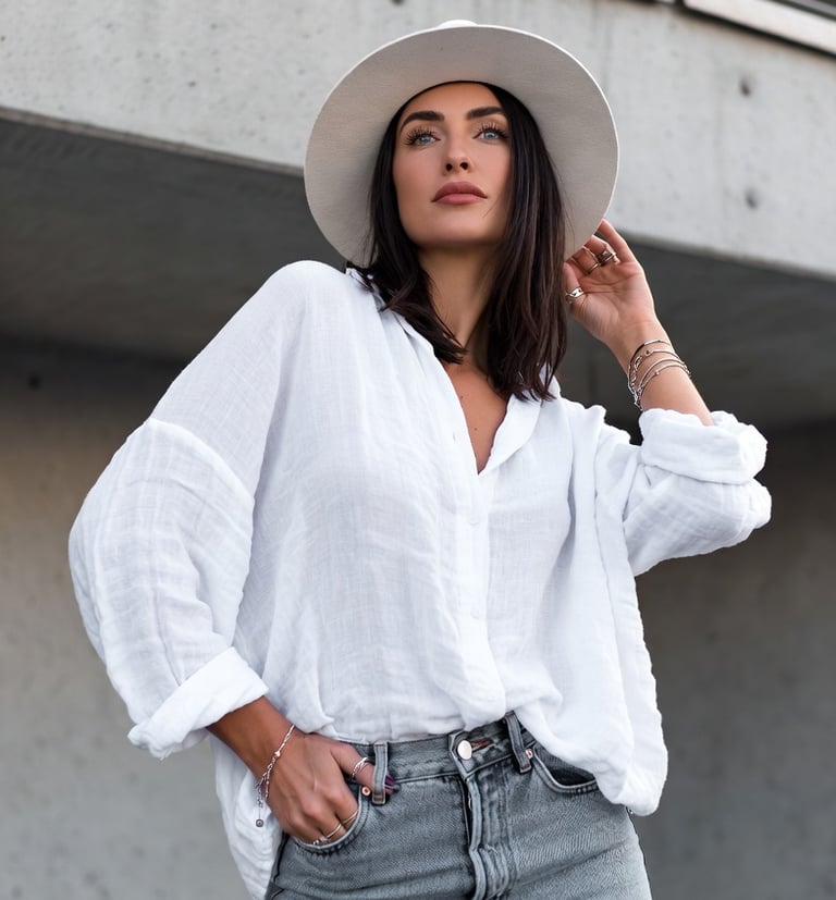 This style epitomizes relaxed contemporary cool, blending oversized silhouettes with rugged textures for a look that is both comfortable and chic. It features a voluminous, semi-sheer white linen button-down shirt with rolled sleeves, tucked loosely into distressed, high-waisted grey denim jeans to create a balanced, lived-in aesthetic. The ensemble is elevated by a crisp, structured white fedora that adds a touch of sophisticated flair, while layered silver bracelets and delicate rings provide a hint of personalized minimalism. This look is perfect for the modern individual seeking a stylish yet approachable outfit for city strolls or casual social gatherings.